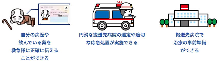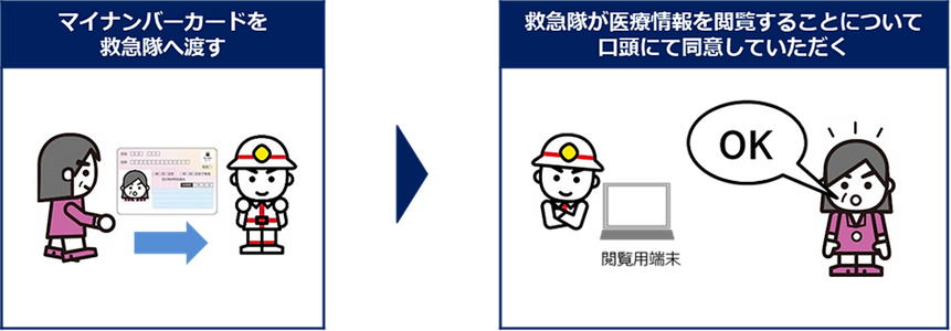 救急隊員が傷病者のマイナ保険証(健康保険証として利用登録したマイナンバーカード)を活用し、病院選定などに役立つ情報を把握することで、より円滑に医療機関に搬送できるようになる取組みです。